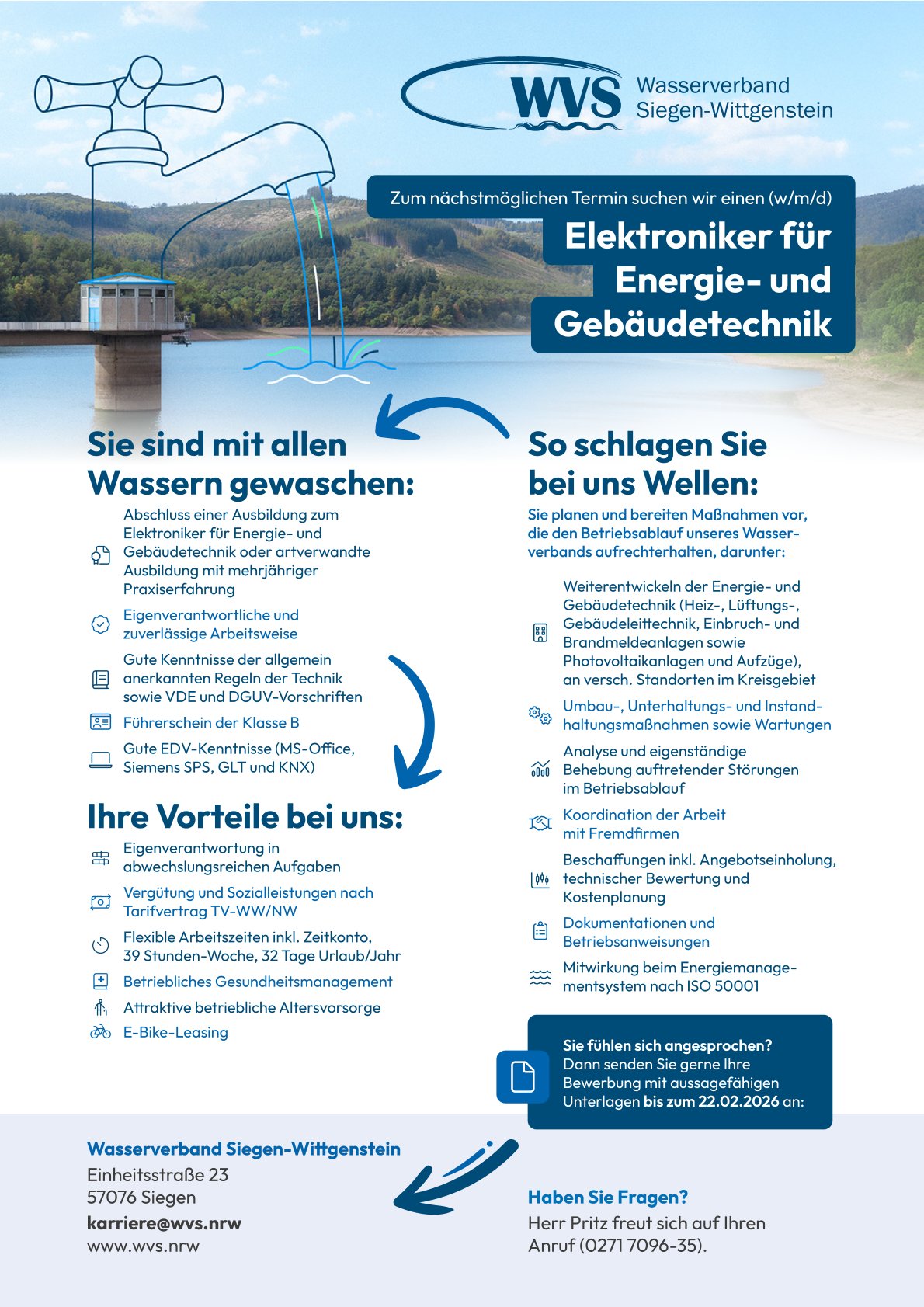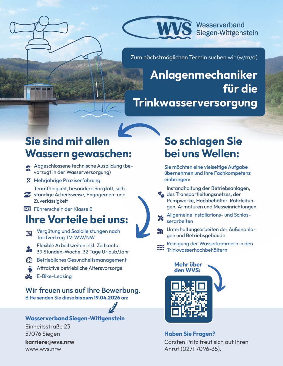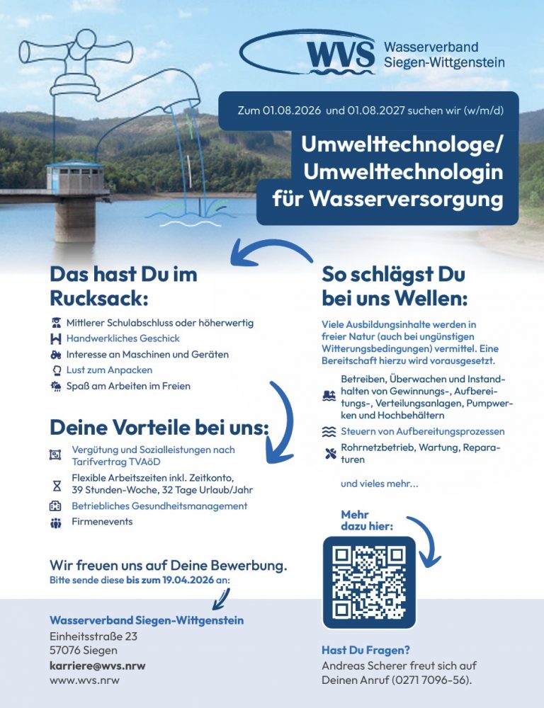 Der Wasserverband Siegen-Wittgenstein ist aber auch ein wichtiger und attraktiver Arbeitgeber und Ausbildungsbetrieb in der Region, der wichtige und teils außergewöhnliche und spannende Jobs anbietet.