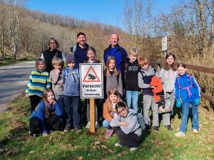 Mit sichtbarer Freude und einer großen Portion Tatendrang haben die Mädchen und Jungen des „Radios der Zukunft“ – einer AG der Grundschule Deuz in Zusammenarbeit mit dem Verein Qulturwerkstatt – jetzt mit dem Wasserverband Siegen-Wittgenstein (WVS) neue Hinweisschilder zur Krötenwanderung rund um die Obernautalsperre aufgestellt. Diese sollen Besucherinnen und Besucher der Talsperre dafür sensibilisieren, während der Wanderzeiten besonders auf Kröten und andere Amphibien zu achten. Denn die Talsperre und ihre Zuläufe sind Laichgewässer, die Wanderung zu den Laichplätzen kostet aber viele Tiere das Leben. Generell stellen Autos die größte Gefahr dar: von 100 Kröten, die innerhalb einer Stunde eine Straße überqueren, auf der zehn Autos fahren, überlebe nur jede fünfte, erklärte Ursula Wussow von der Qulturwerkstatt den Kindern. Der Fahrzeugverkehr ist auf dem Rundweg um die Talsperre aufgrund der Wasserschutzzone zwar stark eingeschränkt, dennoch seien aber auch hier immer wieder tote Kröten zu beklagen, die versehentlich von Spaziergängern zertrampelt oder von Radfahrern überrollt würden, berichtete Stauanlagenmeister Lars Rossmanith.